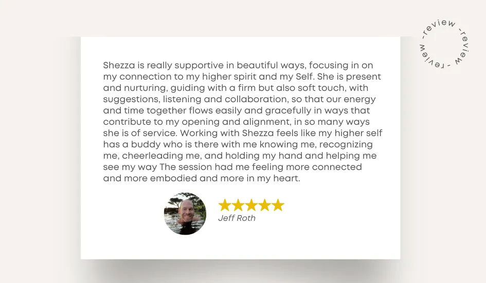 I truly love working with Sheza. She is a beautiful light, deeply loving, supportive, and wise. Every conversation with her leaves me feeling heard, uplifted, and inspired. She listens deeply and offers thoughtful feedback, genuine care, and full presence. I highly recommend Sheza to anyone seeking loving support, kindness, and profound wisdom. She is truly a gift. - Meloney Hudson